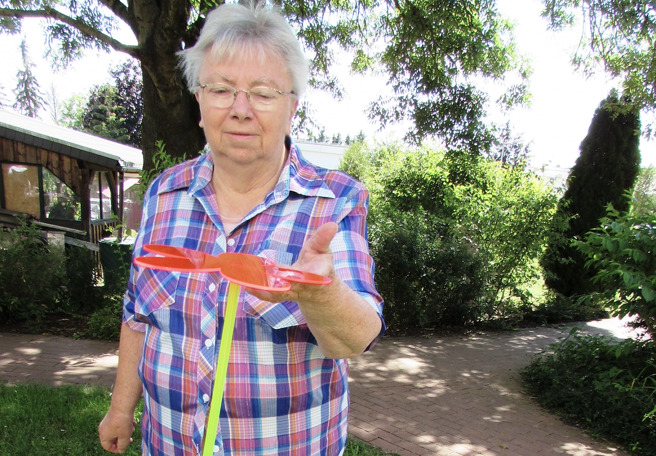 Zur Freude der Senioren hängen die Mobiles bereits an den Zimmerdecken und die Sonnenfänger zieren die Wiese im Garten und reflektieren jetzt fröhlich die Sonnenstrahlen.