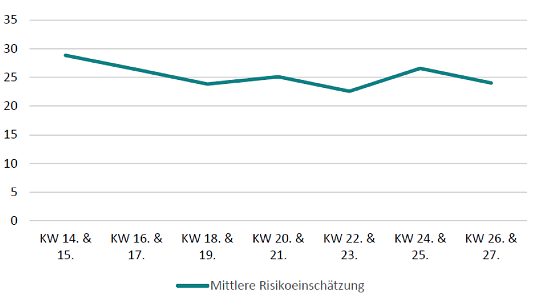 Im zeitlichen Verlauf der Befragung schätzten die Befragten ihr Risiko im Durchschnitt als zunehmend geringer ein und bewegten sich somit in Richtung der Einschätzungen der ExpertInnen (Abbildung 2). Lag Anfang April das durchschnittlich genannte lebensbedrohliche Erkrankungsrisiko noch bei 28,8 Prozent (Kalenderwoche 14 & 15), sank es bis Ende Juni auf 24,0 Prozent (Kalenderwochen 26 & 27). Der Median hat sich dabei nicht verändert und bleibt konstant bei 20. Die Erhöhung des Realitätsgehalts des genannten lebensbedrohlichen Erkrankungsrisikos durch die Befragten kann sowohl an den zunehmend verlässlicheren Statistiken liegen wie auch daran, dass die Befragten durch die Medien und durch eigene Internetrecherchen zunehmend besser informiert wurden, die Kontaktbeschränkungen offensichtlich wirkten und somit das Infektions- und Erkrankungsrisiko sank.[5]