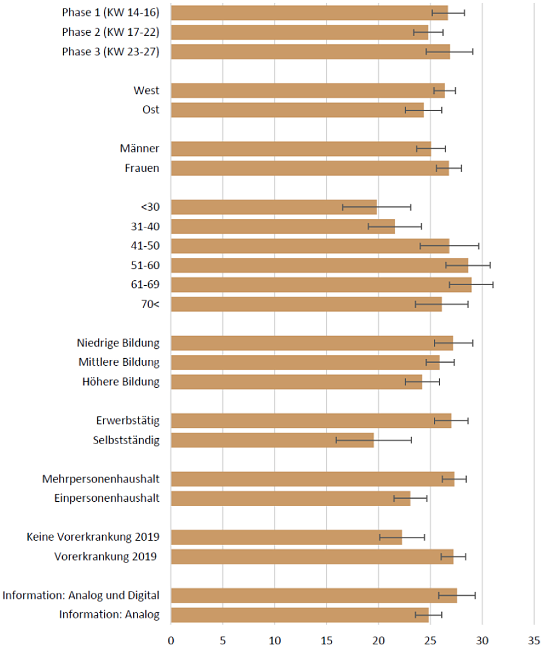 Dieser deskriptive Befund bestätigt sich nach Einbezug anderer Personen- und Haushaltsmerkmale jedoch lediglich für den Übergang von der ersten Phase des kompletten Lockdowns (Kalenderwoche 14 bis 16) in die zweite Phase der punktuellen Lockerungen (Kalenderwoche 17 bis 22). Nachdem in der Kalenderwoche 23 bundesweit sehr weitgehende Lockerungen des Social Distancing und der damit verbundenen Maßnahmen erfolgt sind, stieg das wahrgenommene Risiko tendenziell wieder an. Freilich sollte dieser Anstieg von der zweiten zur dritten Phase der multivariat geschätzten Erkrankungswahrscheinlichkeit in den Kalenderwochen 23 bis 27 nicht überbewertet werden, da er aufgrund kleiner Fallzahlen nicht statistisch signifikant ist.[6]