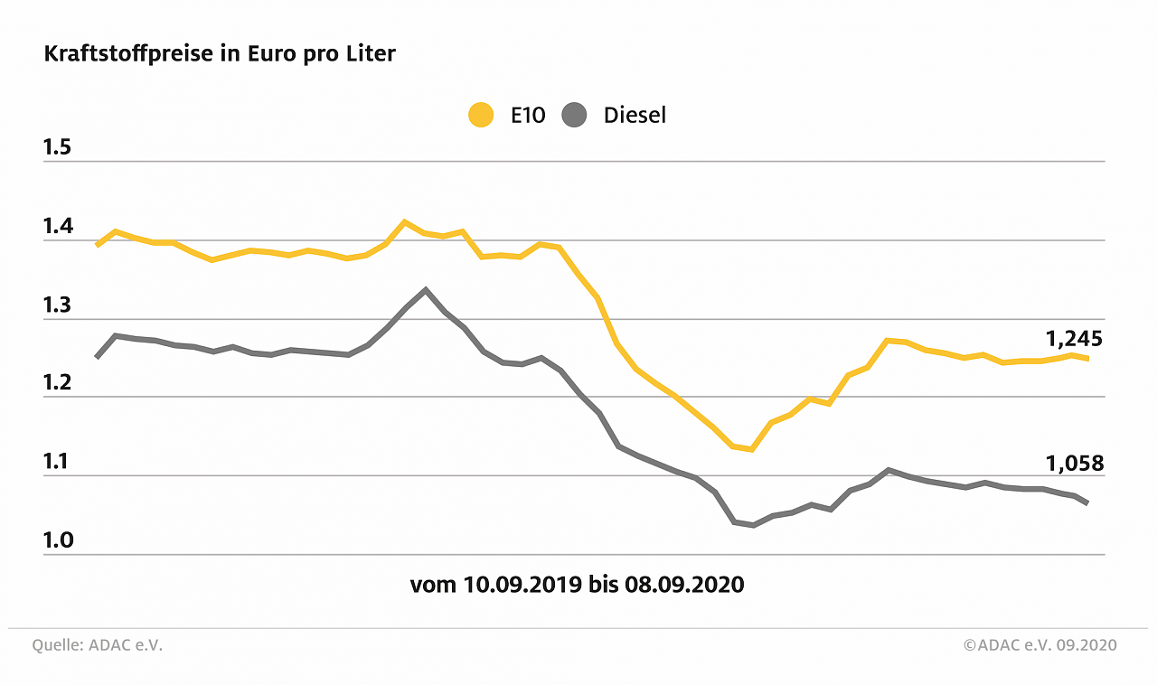 Die Kraftstoffpreise sind im Wochenvergleich zurückgegangen. Für Super E10 verzeichnet der ADAC einen Rückgang von 0,9 Cent. Ein Liter kostet im Bundesschnitt 1,245 Euro. Beim Diesel ist ein noch stärkerer Preisrückgang zu verzeichnen. Hier sinkt der Preis für einen Liter um 1,4 Cent auf 1,058 Euro...