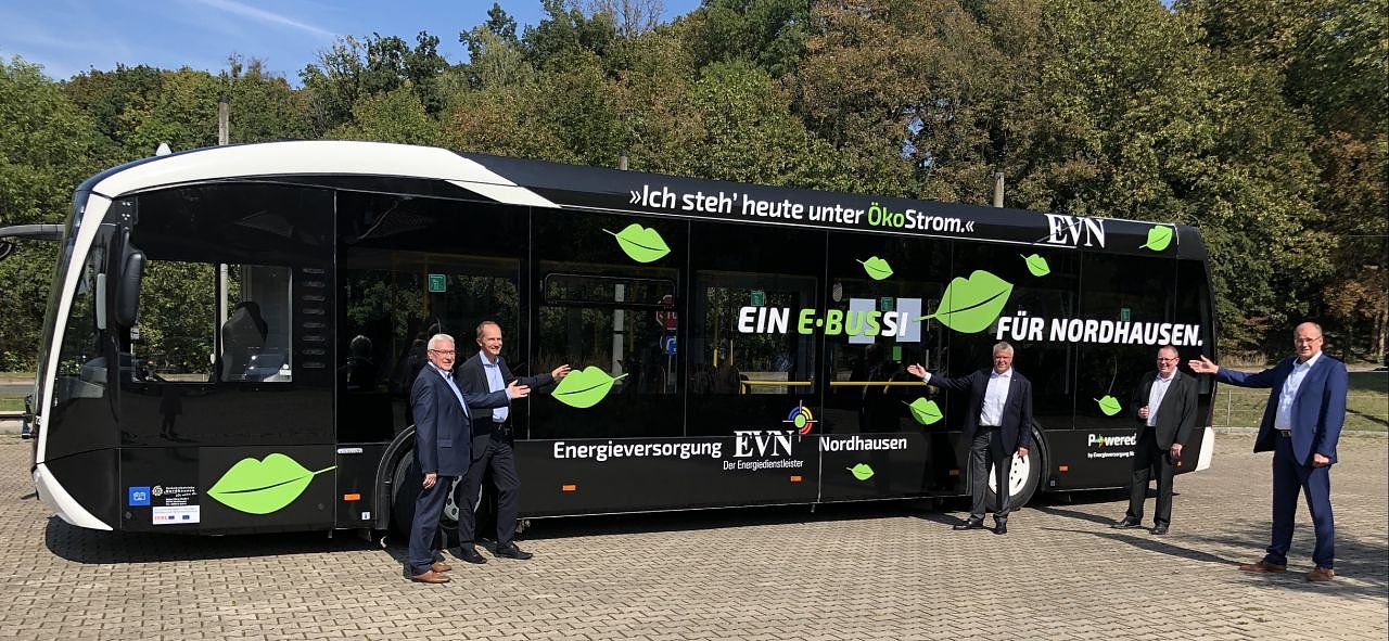 Die Geschäftsführer der EVN sowie die Geschäftsführung der Stadtwerke Nordhausen-Holding für Versorgung und Verkehr GmbH (HVV) und der Verkehrsbetriebe Nordhausen GmbH (VBN) schickten den Elektro-Bus heute gemeinsam auf die klimafreundliche Energietour durch den Landkreis Nordhausen. Es passt natürlich thematisch, wenn die EVN als örtlicher Energieversorger auf einem unserer neuen E-Busse wirbt, schließlich beziehen wir den benötigten Strom von der EVN und stärken damit auch gleich den regionalen Wirtschaftskreislauf, so Landrat Matthias Jendricke. Die Landkreisverwaltung hat insgesamt sechs Elektro-Busse für den Regionalverkehr angeschafft.