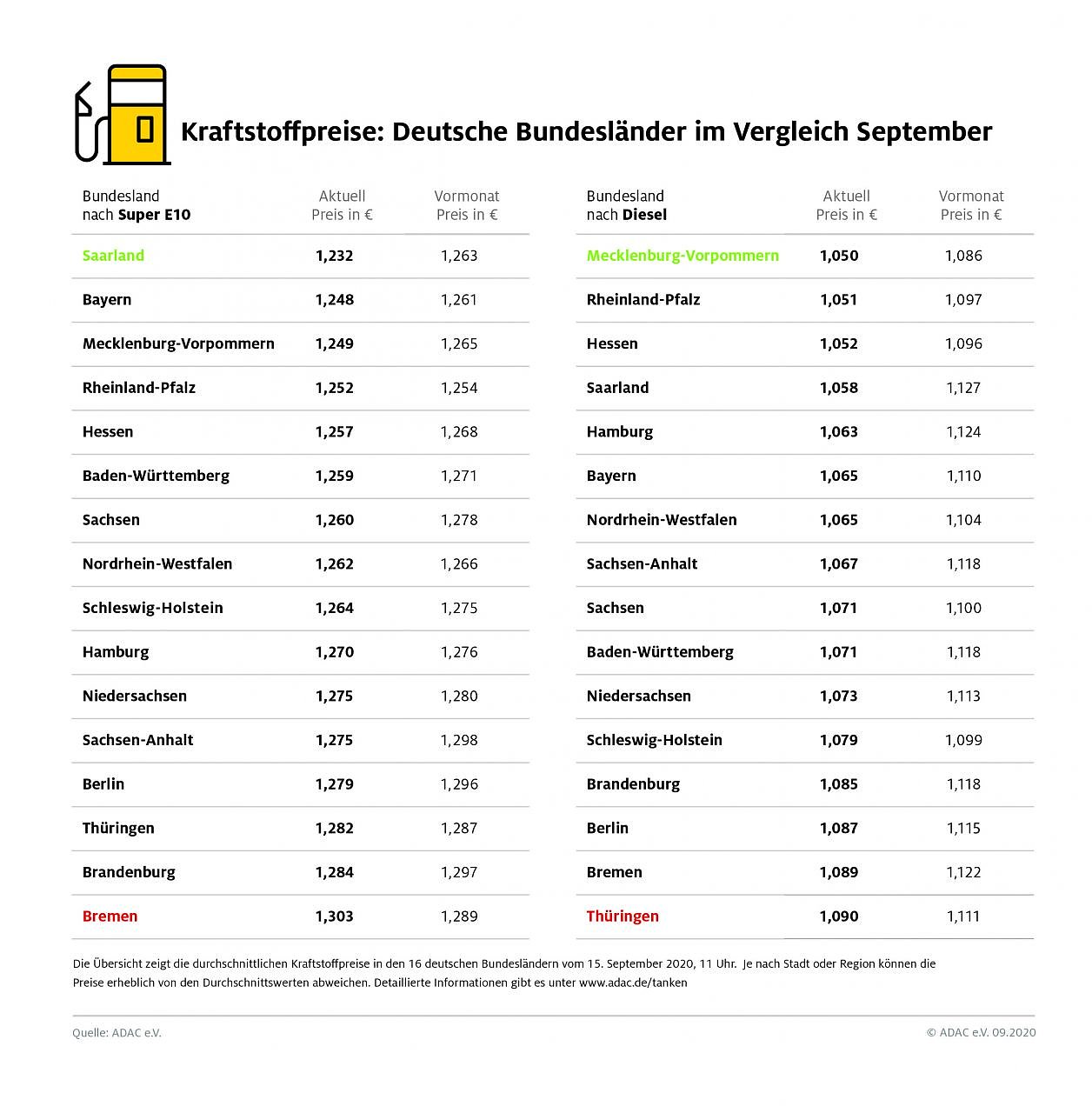 Diesel ist mit durchschnittlich 1,050 Euro je Liter in Mecklenburg-Vorpommern am günstigsten. In Thüringen, dem teuersten Bundesland, müssen Autofahrer mit 1,090 Euro je Liter 4,0 Cent mehr bezahlen. Auffällig ist, dass man im Stadtstaat Bremen besonders teuer tankt. Auch Diesel ist hier mit durchschnittlich 1,089 Euro je Liter nur unwesentlich billiger als in Thüringen. Traditionell sind die Kraftstoffpreise in Stadtstaaten eher günstig.