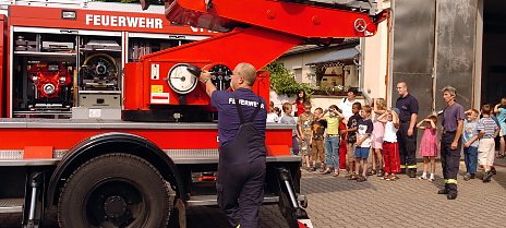 Wie hoch ist denn das Auto? fragt der Junge und schätzt übertrieben. Acht Meter. Nur 3,80 Meter erreicht das Fahrzeug, die Leiteraufbauten mitgerechnet. Die 30 Meter hohe Drehleiter beeindruckt die Kinder dann noch mehr. Extra für die Jungs und Mädchen wurde sie ausgefahren, aber draufklettern darf keiner, obwohl manche gern gewollt hätten.