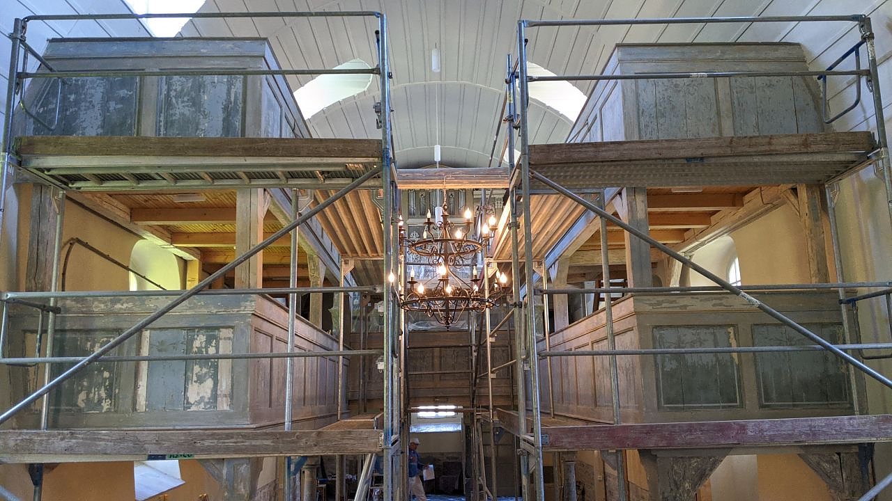 Vor gut 10 Tagen sind die frisch gestrichenen Kirchenbänke wieder an ihren vertrauten Ort gekommen, berichtet Pfarrer Thomas Ahlhelm von den letzten Arbeiten. Und erst vorigen Montag konnte man sich zum vorerst letzten großen Kirchenputz treffen. Wenn man die Vorher-Nachher-Bilder des Architekten Karsten Tölle vergleicht, dann sieht man was in diesem Gotteshaus geleistet wurde.