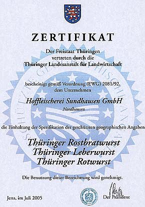 Die Hoffleischerei Sundhausen GmbH vom Scheunenhof ist einer der111 landwirtschaftlichen Betriebe, die in der vergangenen Woche das Zertifikat für geschützte Wurst seitens der Landesanstalt für Landwirtschaft erhalten haben. Thüringer Rostbratwurst, Thüringer Leberwurst und Thüringer Rotwurst