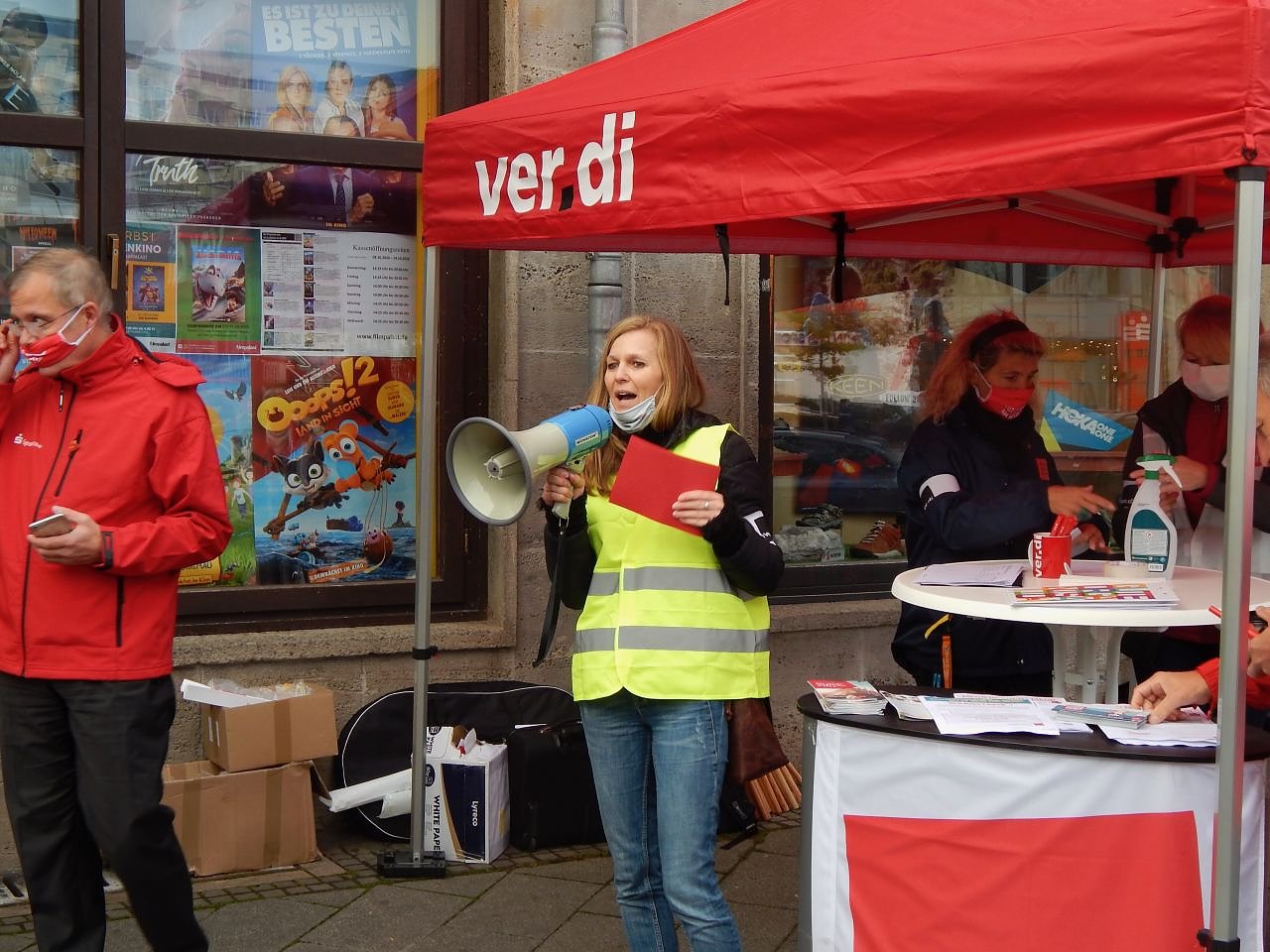 Die Arbeitgeberseite habe zu Beginn der ersten Verhandlungsrunde in Potsdam Anfang September trotz Rekordzahlen im ersten Halbjahr ein düsteres Bild der Zukunft entworfen, erklärte Gewerkschaftssekretärin Katrin Beerens vor dem Nordhäuser Kino. Die Gewerkschaft habe zunächst einen anderen Lösungsweg angestrebt, will nun aber mit Maximalforderungen in die weiteren Verhandlungen gehen. Zum Paket gehören Lohnerhöhungen um 150 Euro für Angestellte und 100 Euro für Auszubildende, Entlastungstage, eine Verlängerung der Altersteilzeit und natürlich die Sonderzahlung. Außerdem will man um eine Angleichung der Arbeitszeit an die westlichen Bundesländer erkämpfen. Die sei längst überfällig, rief Beerens durch das Megaphon, wo die Kollegen im Osten 40 Stunden arbeiten seien es für den gleichen Lohn im Westen nur 39 Stunden. Das klinge erst einmal nicht nach einem großen Unterschied, summiere sich aber zusammen: auf rund sechs Arbeitstage im Jahr oder 180 Arbeitstage in den letzten 30 Jahren.