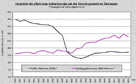 Im Jahr 2004 wurden in Thüringen nach Mitteilung des Thüringer Landesamtes für Statistik 17 310 Kinder lebend geboren, darunter 480 als Mehrlingskinder (468 Zwillingskinder und 12 Drillingskinder). Während sich die jährlichen Geburtenzahlen in Thüringen schon seit 1980 kontinuierlich, darunter von 1990 bis 1994 drastisch, abwärts bewegten, ist seit 1995 wieder ein geringer Anstieg der Zahl der Lebendgeborenen zu registrieren. Dabei entsprach die Zahl der Lebendgeborenen im vergangenen Jahr 43 Prozent des Niveaus von 1980.