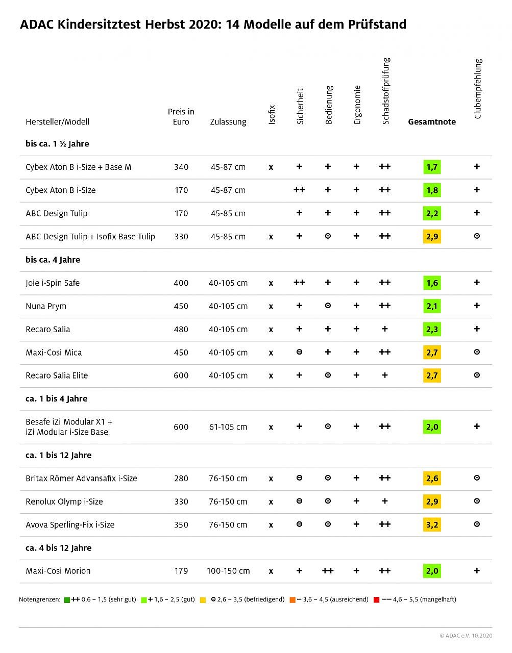 Acht Sitze erhalten das ADAC Urteil gut, sechs werden mit befriedigend bewertet. Dabei konnte die Tester der Joie i-Spin Safe am meisten überzeugen. Er ist für Kinder bis etwa vier Jahre geeignet und bekommt die Bestnote 1,6. Ebenfalls gut abschneiden konnte mit einer Gesamtnote von 1,7 der Cybex Aton B i-Size + Base M, für Kinder bis ca. eineinhalb Jahre.