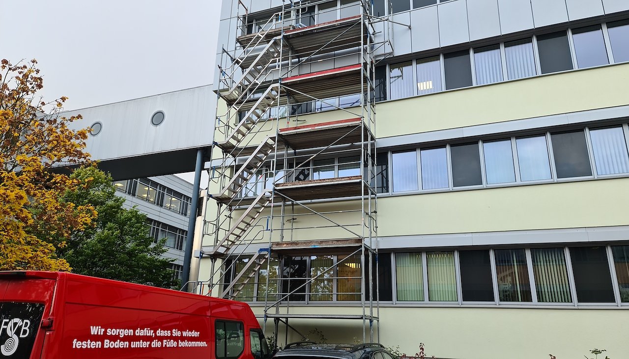 So musste der bisherige Estrich komplett über Rutschen nach außen transportiert werden. Auch der Zugang für die Handwerker erfolgte nur durch eine an der Fassade angebrachte Konstruktion (siehe Bild). Dazu Klinik-Geschäftsführer Guido Hage: Ich möchte an dieser Stelle allen Beteiligten meinen Dank aussprechen. Die Zusammenarbeit sowie das Verständnis untereinander haben dazu beigetragen, dass wir den Austausch in einem kurzen Zeitraum und ohne Komplikationen realisieren konnten.” Gekostet hat der Austausch rund 30.000 Euro. Parallel dazu wurden auch die Brandmelder in diesen Bereichen ausgetauscht.