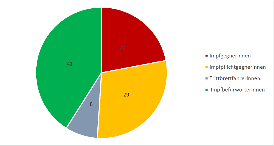 Die Gesamtbevölkerung lässt sich somit in vier Gruppen aufteilen: die ImpfgegnerInnen, die gegen eine Impfpflicht sind und sich auch nicht freiwillig impfen lassen würden, die PflichtgegnerInnen, die zwar ebenfalls gegen eine Impfpflicht sind, sich jedoch freiwillig impfen lassen würden, dann die TrittbrettfahrerInnen, die für eine Impfpflicht sind, sich aber nicht selbst freiwillig impfen lassen würden, und die ImpfbefürworterInnen, die ebenfalls für eine Impfpflicht sind und sich selbst freiwillig impfen lassen würden.