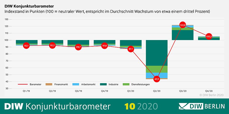 Nachdem die Wirtschaft im abgelaufenen dritten Quartal dem Konjunkturbarometer des Deutschen Instituts für Wirtschaftsforschung (DIW Berlin) zufolge noch deutlich um etwa sechs Prozent gewachsen sein dürfte, verdüstern sich die weiteren Aussichten erheblich. Das DIW-Konjunkturbarometer fällt für das Schlussquartal dieses Jahres von 122 Punkten auf 105 Punkte.