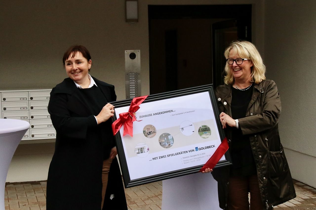 Mitte des Monats sollen die ersten Mieter einziehen können, 15 der 30 Wohnungen sind bereits vergeben. Stellvertretend für die neuen Bewohner nahmen heute Steffi und Christian Müller den symbolischen Schlüssel aus den Händen Inge Klaans entgegen. Die bauausführende Firma hatte zur Feier des Tages zudem noch eine Überraschung parat: die Firma Goldbeck spendiert dem Grundstück zwei zusätzliche Spielgeräte.