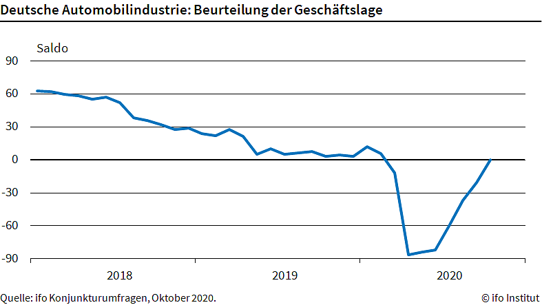 Im Oktober stieg der Lage-Indikator auf minus 0,2 Punkte, nach minus 20,4 Punkten im September. Das Tief lag im April bei minus 86,2 Punkten. Die Nachfrage nach Autos hat merklich angezogen. Das hat die Stimmung unter den Managern erheblich verbessert, sagt der Leiter der ifo-Umfragen, Klaus Wohlrabe.