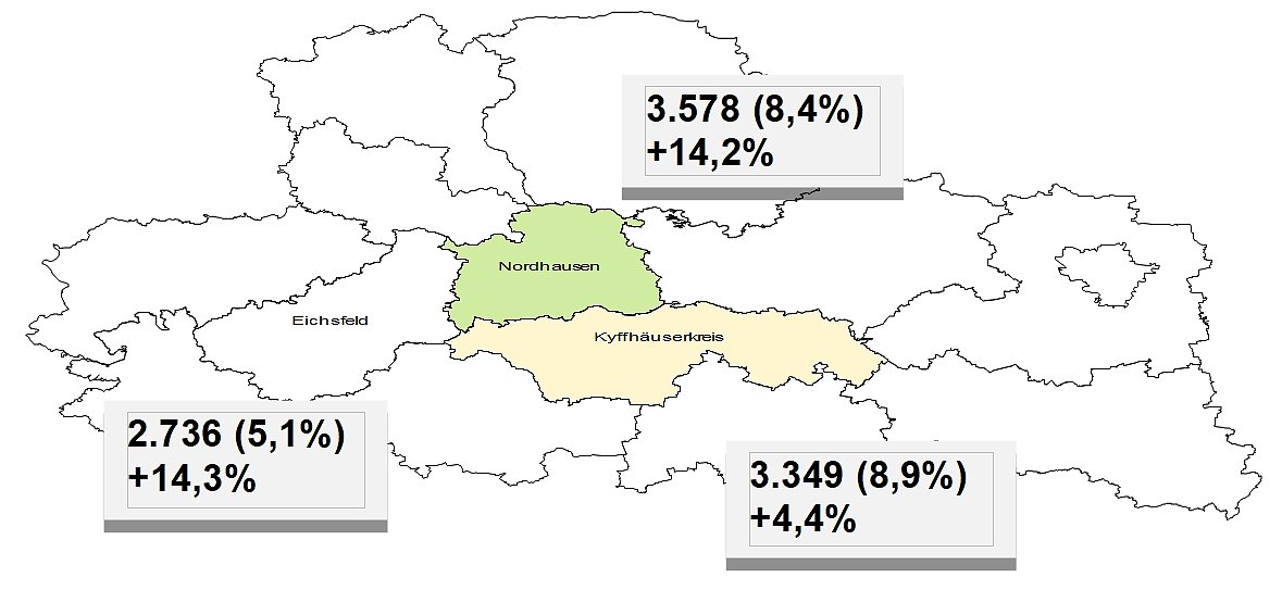 Arbeitslosigkeit unterschiedlich stark gestiegenIm Landkreis Nordhausen wurden im Februar 3.578 Arbeitslose registriert, rund zwei Prozent mehr als vier Wochen zuvor und vierzehn Prozent höher als im Vorjahresmonat. Die Arbeitslosenquote lag bei 8,4 Prozent. Im Jahr zuvor betrug sie 7,4 Prozent.