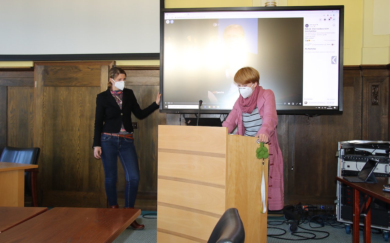 Pressesprecherin Jessica Piper (re.) bereitet die Pressekonferenz im großen Plenarsaal vor (Foto: oas)