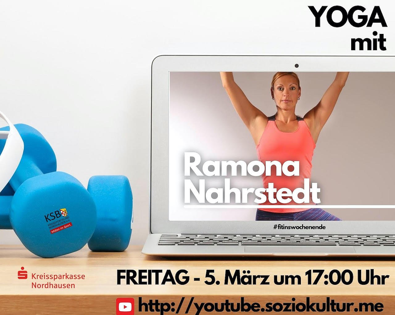 Wenn es um YOGA in Nordhausen geht, muss zwangsläufig der Name Ramona Nahrstedt genannt werden. Ihre Qualifikationen: Group B-Lizenz-Trainerin, Yogalehrerin 500h Ryt, Ayurvedatherapeutin, Yoga Referentin der Aciso Academy oder auch Med. Ernährungsberaterin sprechen für sie. Wir freuen uns Ramona für das Projekt Fit ins Wochenende gewinnen zu können. Die Zusammenarbeit ist nicht neu. Auch zur Aerobic-Night oder dem Frauensporttag war Ramona schon im Auftrag des KSB Nordhausen e.V. unterwegs. Wir freuen uns auf eine entspannende Yoga-Einheit mit Ramona Nahrstedt.