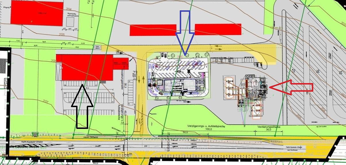 Noch lassen sich die Investoren nicht vollends in die Karten schauen. Was aber der nnz bestätigt wurde ist, dass es neben einem Discounter mit einer Verkaufsfläche von 800 Quadratmeter (schwarzer Pfeil), einem Fast-Food-Restaurant (blauer Pfeil), natürlich auch eine Tankstelle (roter Pfeil) geben soll. Hinzu kommen 50 Lkw-Stellplätze sowie ein Technikstützpunkt für Landtechnik.