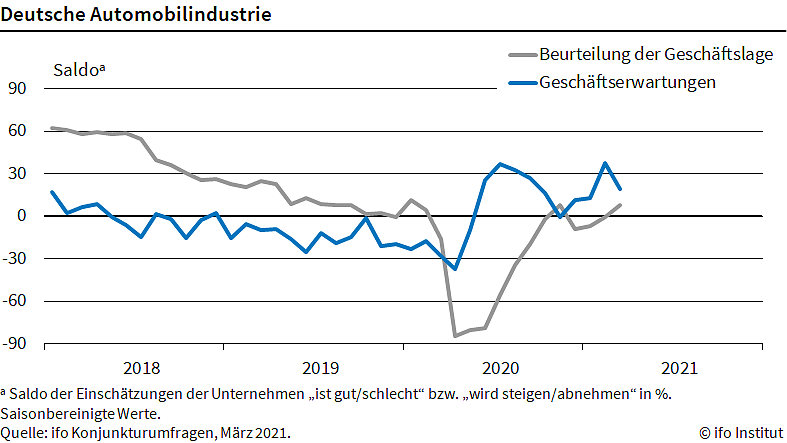 Die Autobauer konnten aber ihre Auftragsbücher weiter füllen, fügt Wohlrabe hinzu. Bei der Nachfrage stieg der Umfragewert im März auf 10,7 Punkte, nach minus 1 im Februar. Der Auftragsbestand legte nur leicht zu. Der Wert lag bei 14,8 Punkten, nach 11,7 im Februar.