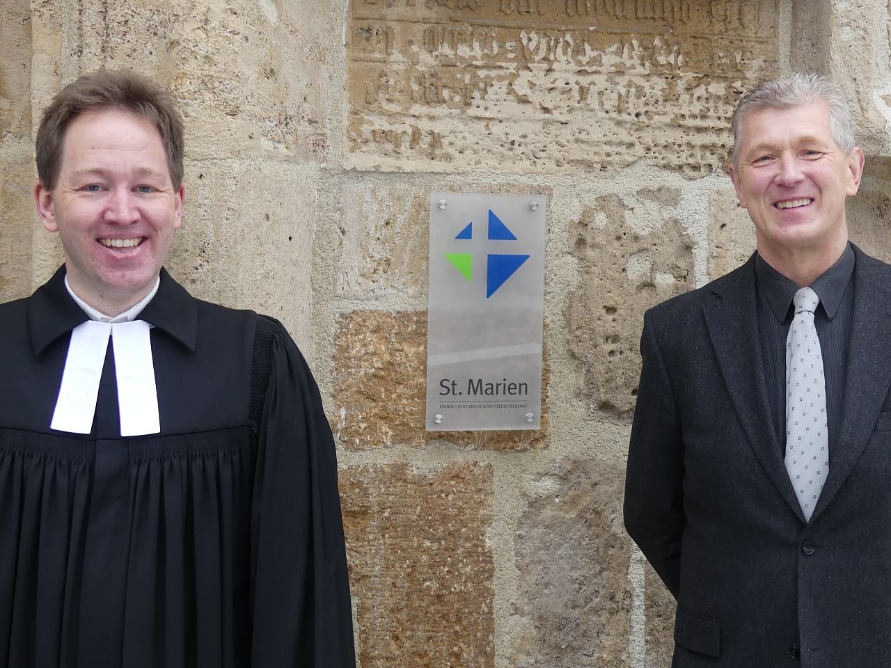 Pfarrer Matthäus Monz und der Vorsitzende des Gemeindekirchenrates Dr. Christoph Maletz freuen sich auf den Dienstbeginn des neuen Bleicheröder Pfarrers zum 1. Mai 2021. Hier nach dem Vorstellungsgottesdienst am 24. Januar vor St. Marien. (Foto: Evangelischer Kirchenkreis Südharz)