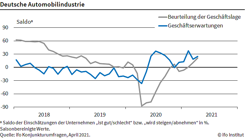 Die aktuellen Geschäfte der deutschen Autohersteller und ihrer Zulieferer sind im April besser gelaufen als im Vormonat. Der Indikator zur Geschäftslage für die Branche stieg auf plus 21,6 Punkte, nach plus 10,7 im März. Das ist der beste Wert seit April 2019...