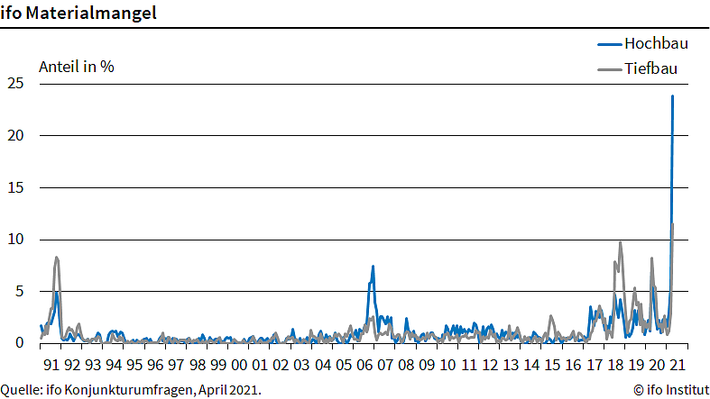 Im Hochbau berichteten im April 23,9 Prozent der Firmen, sie hätten Probleme, rechtzeitig Baustoffe zu beschaffen. Im März waren es noch 5,6 Prozent gewesen. Auch im Tiefbau hat sich die Knappheit im April deutlich verschärft, auf 11,5 Prozent von 2,9 Prozent im März.