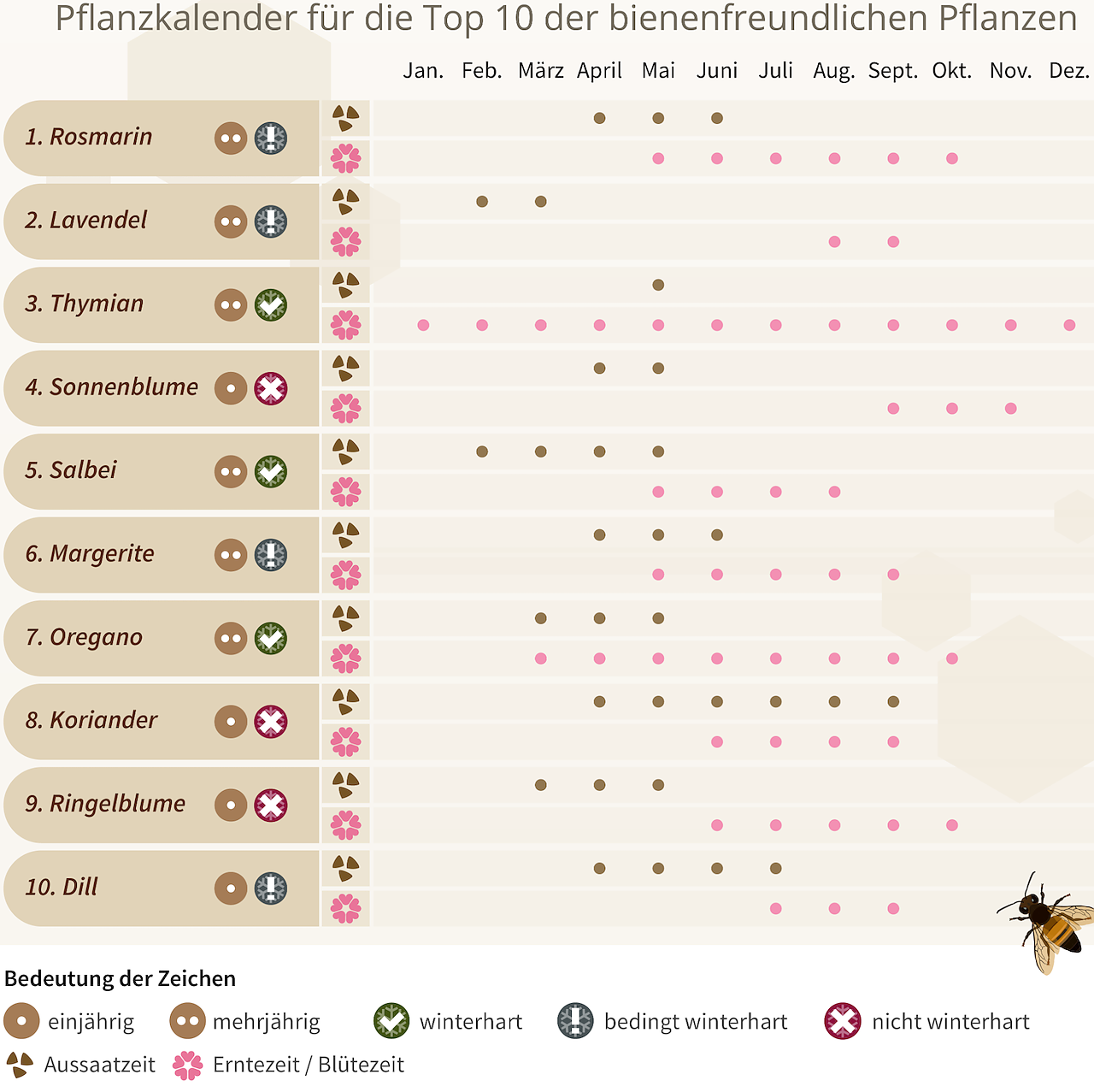 Das beliebte Küchenkraut bietet den Bienen mit seinen hübschen rosafarbenen, violetten und weißen Blütenteppichen besonders viel Nektar. Das mediterrane Gewürz kommt auf 298.470 monatliche Google-Suchanfragen. Der Halbstrauch ist nicht pflegeintensiv, sollte aber einmal jährlich zurückgeschnitten werden, da er sonst zu sehr verholzen könnte. Die Aussaatzeit ist im Mai, Pflanzzeit von März bis Juni. Ernten kann man ihn das ganze Jahr.