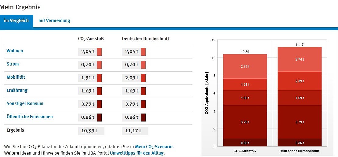 Die Grafik zeigt einen Vergleich zwischen unterschiedlichen Mobilitätsverhalten im CO2-Rechner des Umweltbundesamts. Es wird eine jährliche Fahrstrecke von 8000 km angenommen. Während der deutsche Durchschnitt (rechter Balken) jährlich ca. 6000 km mit dem PKW und 2000 km mit Verkehrsmitteln des ÖPNVs zurücklegt, wird links ein klimafreundlicheres Verkehrsverhalten dargestellt. 4000 km werden hier mit ÖPVN zurückgelegt, 2000 km mit dem Rad und immer noch 2000 km mit PKW, der beispielsweise für Großeinkäufe genutzt wird. Es wurde bewusst nicht komplett auf das Auto verzichtet, um darzustellen, dass einige Fahrten nicht adäquat durch ÖPVN und Rad ersetzt werden können. Man erkennt, dass dieser moderate Wechsel des Verkehrsmittels schon einen Einfluss von 0,78 t CO2-Äquivalenten bewirkt.