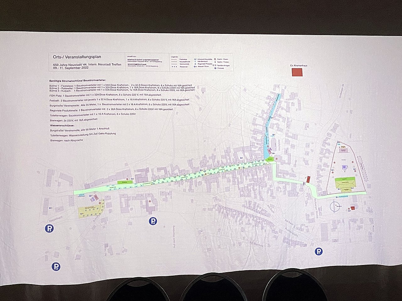 Die Finanzierung steht zwar noch nicht aber wir müssen für die Planungen jetzt anfangen, sagt Peter Fricke und erläutert einen bunten Ortsplan, auf dem verschiedene Bereiche gekennzeichnet sind. In der Burgstraße sollen sich die Vertreter aus den anderen europäischen Neustädten präsentieren, es wird Händler geben und kulinarische Köstlichkeiten. Die Badestraße wird zur Vereinsmeile. Vorerst sind drei Bühnen geplant: auf dem Wiesenplatz, auf dem Kirchplatz und im Kurpark. An der Feuerwehr werden ein Riesenrad und Attraktionen für die Kleinsten aufgebaut, in der Feuerwehr soll sich das Lagezentrum beispielsweise für die Erste Hilfe und Security befinden. Am Gondelteich dreht sich alles um Spiel, Spaß, Sport und Aktion für Familien. Gemeinsam mit dem Nordhäuser Kreissportbund werden hier verschiedene Geräte und Spiele aufgebaut.