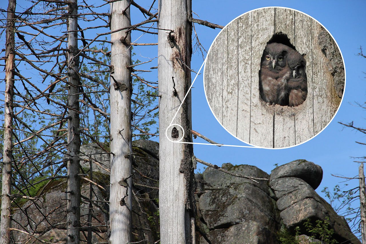 Auch der Schwarzspecht gehört schon heute zu den Gewinnern des Waldwandels. Er hat im Totholz lebende Insekten zum Fressen gern und zimmert seine Höhlen in die Stämme. Diese Baumhöhlen bieten in den darauffolgenden Jahren noch vielen anderen Tieren einen willkommenen Nistplatz oder dienen als Wohn- und Winterquartier, zum Beispiel für Siebenschläfer oder den Raufußkauz.