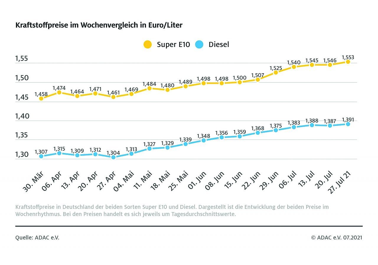 Wie die wöchentliche ADAC Auswertung der Kraftstoffpreise in Deutschland zeigt, kostet ein Liter Super E10 zurzeit im bundesweiten Schnitt 1,553 Euro und damit 0,7 Cent mehr als vor einer Woche. Diesel verteuerte sich um 0,4 Cent und kostet aktuell 1,391 Euro. Vor einer Woche hatten deutlich sinkende Rohölnotierungen nicht zu einem niedrigeren Kraftstoffpreisniveau an den Tankstellen geführt.