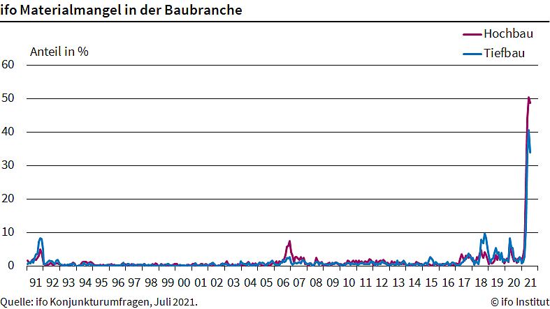 Der Materialengpass auf dem Bau hat sich geringfügig abgemildert. Das geht aus den Umfragen des ifo Instituts hervor. Im Juli meldeten 48,8 Prozent der Betriebe auf dem Hochbau, ihre Geschäfte hätten unter Lieferverzögerungen bei Vorprodukten gelitten...