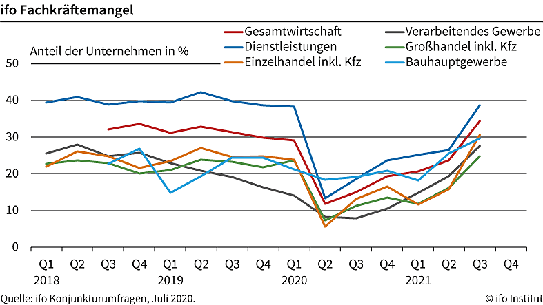 Im Einzelhandel verdoppelte sich die Zahl der Firmen, die Engpässe bei Fachkräften sehen, zwischen April und Juli fast von 15,7 auf 30,6 Prozent. Im Großhandel waren es 24,7 nach 16,1 Prozent. In beiden Branchen war der Anteil noch nie zuvor so hoch. Gleiches gilt für die Industrie. Dort beobachten 27,6 Prozent der Firmen einen Fachkräftemangel, nach 19,4 Prozent im April. Die am stärksten betroffenen Dienstleistungsbranchen sind die Vermittler von Arbeitskräften (75,4 Prozent), Hotels und Pensionen (56,0 Prozent) sowie Speditionen (54,6 Prozent).