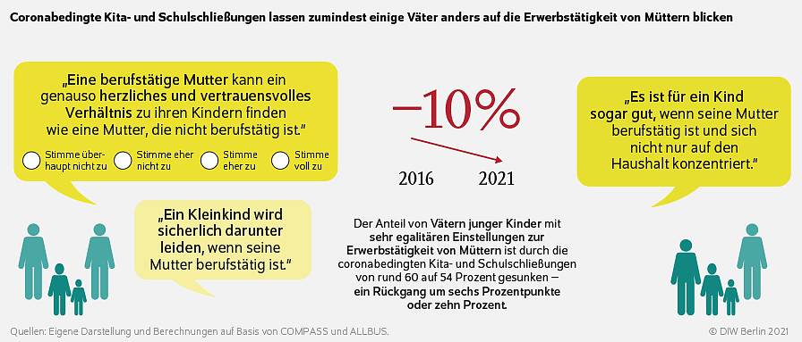 Die Politik sollte die Erkenntnisse der Studie den AutorInnen zufolge zum Anlass nehmen, neben den direkten Folgen der Kita- und Schulschließungen auch Nebenwirkungen wie die möglichen langfristigen Einstellungsänderungen in den Blick zu nehmen. Von einer gesellschaftlichen Rolle rückwärts zu sprechen, wäre derzeit sicherlich noch zu dramatisch, erklärt C. Katharina Spieß. Dafür sei das Bild hinter den aggregierten Veränderungen vermutlich zu heterogen. So könnte es sein, dass in Familien, in denen die Mutter erwerbstätig ist und der Vater im Zuge der Corona-Pandemie aufgrund von Kurzarbeit die zusätzliche Sorgearbeit übernommen hat, die Einstellungen zu Geschlechterrollen sogar egalitärer geworden sind.