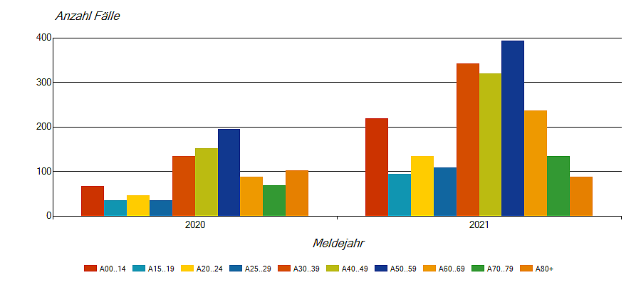 Für den Kreis Nordhausen gestaltet sich die Altersverteilung der Fälle in 2020 und 2021 wie folgt:
