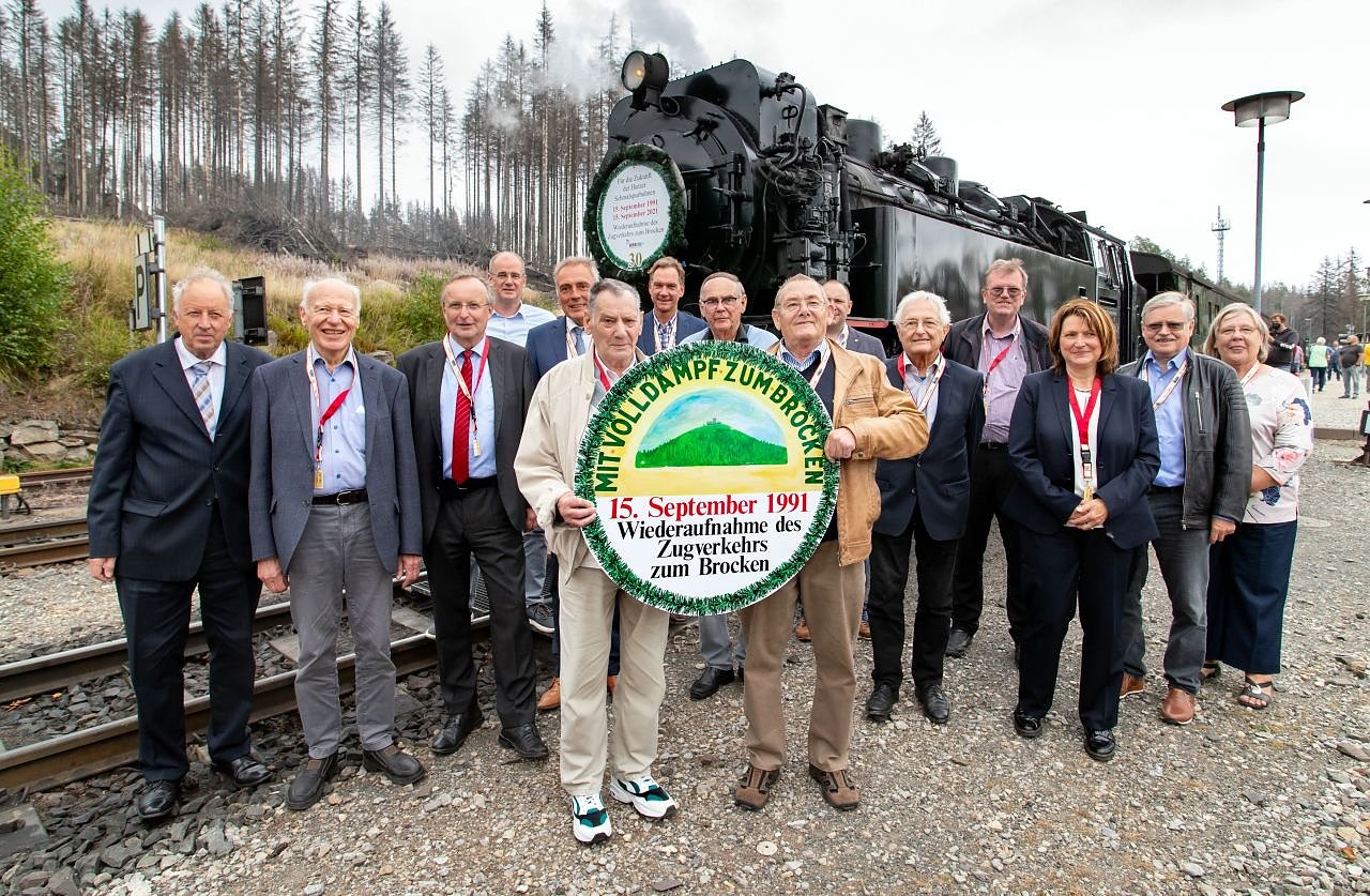 Wie schon vor dreißig Jahren fuhr auch gestern der historische Oldtimerzug der HSB - gezogen von einer Dampflok, die gestern mit dem besonderen Rauchkammerschild 30 Jahre - Wiederaufnahme des Zugverkehrs zum Brocken – 15. September 1991 – 15. September 2021 geschmückt war - von Wernigerode auf den Brocken. Unter den Fahrgästen waren zahlreiche Zeitzeugen, Weggefährten sowie Vertreter aus Politik und Wirtschaft, die während einer Feierstunde im Goethesaal gemeinsam das seit damals unter teils schwierigen und oft turbulenten Bedingungen Erreichte würdigten und Ausblicke auf die zukünftige Entwicklung der HSB gaben.