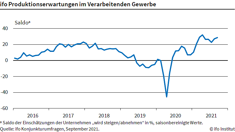 Autor: redDie weiterhin guten Produktionsaussichten lassen sich auch auf Nachholeffekte wegen der Corona-Pandemie zurückführen, sagt Klaus Wohlrabe, der Leiter der ifo-Umfragen. Die Auftragsbücher sind weiterhin voll, nur die Materialengpässe bereiten im Moment Probleme und dämpfen die Produktionspläne etwas.