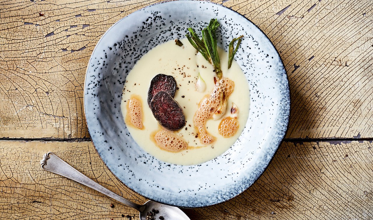 Verfeinert mit einer Einlage aus gebratenen Frühlingszwiebeln, würziger Blutwurst und zartem Apfelschaum wird sie zu einem echten Hingucker auf dem Tisch.
