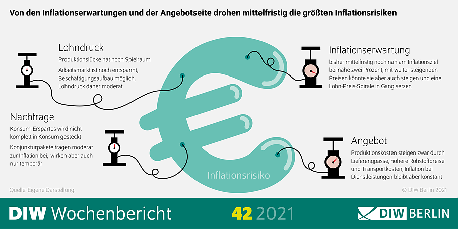 Derzeit tragen vor allem die höheren Energiepreise zur Gesamtinflation im Euroraum bei – mit knapp 50 Prozent. Die klassischen Inflationstreiber wie Lohndruck, Konsum oder Produktionskosten entwickeln sich hingegen eher moderat und wirken nur temporär. Ein Risiko geht jedoch von den Inflationserwartungen aus, die eine Lohn-Preis-Spirale in Gang setzen könnten. Das sind die zentralen Ergebnisse einer aktuellen Studie des Deutschen Instituts für Wirtschaftsforschung (DIW Berlin).