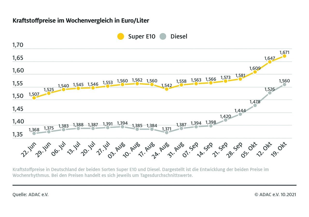 Für einen Liter Super E10 ermittelt der Club in seinem Wochenvergleich einen bundesweiten Durchschnittspreis von 1,671 Euro. Das entspricht einem Anstieg von 2,4 Cent im Vergleich zur Vorwoche.