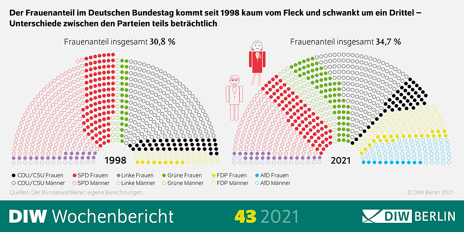 Mit knapp 35 Prozent liegt ihr Anteil zwar vier Prozentpunkte höher als nach der Wahl 2017 insgesamt stagniert die Entwicklung aber seit nunmehr gut 20 Jahren, wie eine aktuelle Studie am Deutschen Institut für Wirtschaftsforschung (DIW Berlin) zeigt. Seit der Bundestagswahl 1998 pendelt der Frauenanteil demnach um etwa ein Drittel aller Abgeordneten. Damit liegt Deutschland zwar im europäischen Durchschnitt, ist von einer Genderparität aber meilenweit entfernt, sagt Kai-Uwe Müller aus der Abteilung Staat des DIW Berlin, der die Studie gemeinsam mit Agnes Blome von der Freien Universität Berlin erstellt hat. Während der Zeit von Angela Merkel als Bundeskanzlerin, die oft als Meilenstein für Frauen in der Politik gewürdigt wurde, ist die Repräsentation von Frauen im Bundestag kaum vom Fleck gekommen, so Müller.