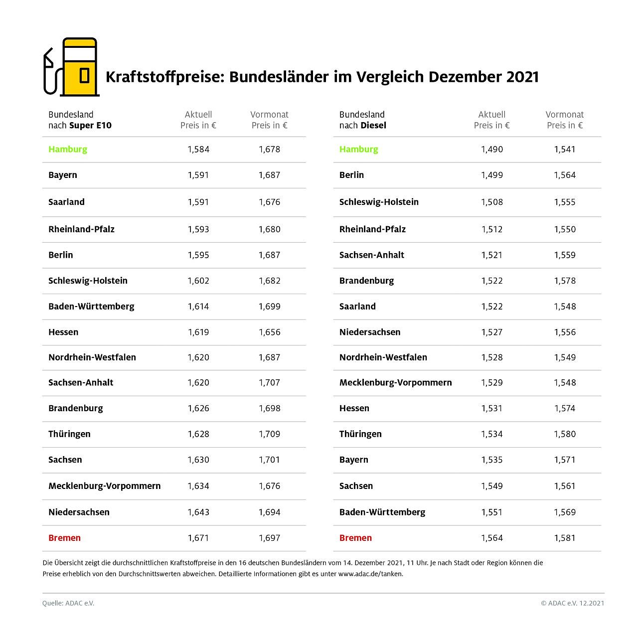Auch bei Diesel ist Hamburg laut ADAC das derzeit günstigste Bundesland: Ein Liter kostet hier 1,490 Euro. Ebenfalls preiswert ist mit Berlin ein weiterer Stadtstaat. Hier kostet Diesel 1,499 Euro. Bremen hält hingegen auch beim Diesel die rote Laterne mit 1,564 Euro. Die Preisdifferenz zwischen teuerstem und günstigstem Bundesland beträgt aktuell 7,4 Cent.
