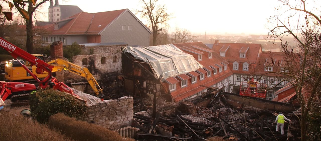 Die Ermittlungen zur Brandursache in dem vom Einsturz gefährdeten Fachwerkbau konnten erst spät und unter schweren Bedingungen beginnen. Inzwischen sei sicher, dass keine vorsätzliche Straftat, also keine Brandstiftung, vorliege, erklärte die Pressesprecherin der Nordhäuser Polizei gegenüber der nnz. Fahrlässigkeit oder ein technischer Defekt stünden weiter im Raum, ließen sich womöglich aber nicht mehr einwandfrei feststellen.