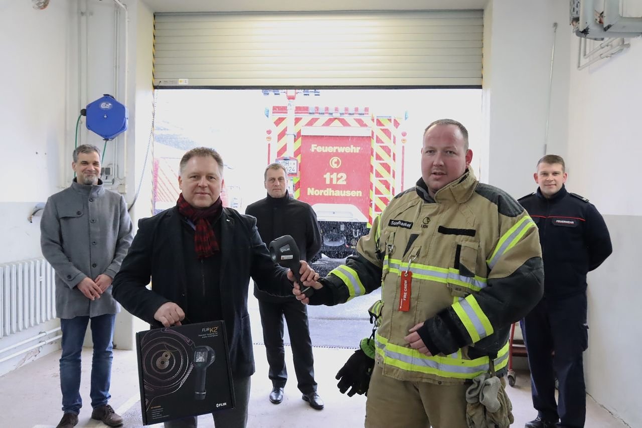 Übergabe der Wärmebildkamera v.l.n.r.: Oberbürgermeister Kai Buchmann; Dieter Jagiella, Direktionsbeauftragter SV SparkassenVersicherung; Jens Ludwig, Versicherungsabteilung Sparkasse Nordhausen; Christian Rißmann, Freiwillige Feuerwehr Sundhausen; Matthias Gropengießer, Berufsfeuerwehr Nordhausen (Foto: Stadtverwaltung Nordhausen)