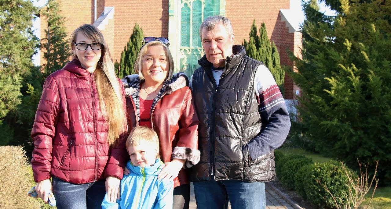 Elena Zazchytska mit Sohn Vadim und ihren Schwiegereltern Tamara und Igor vor der Kirche St. Matthias in Bleicherode (Foto: agl)