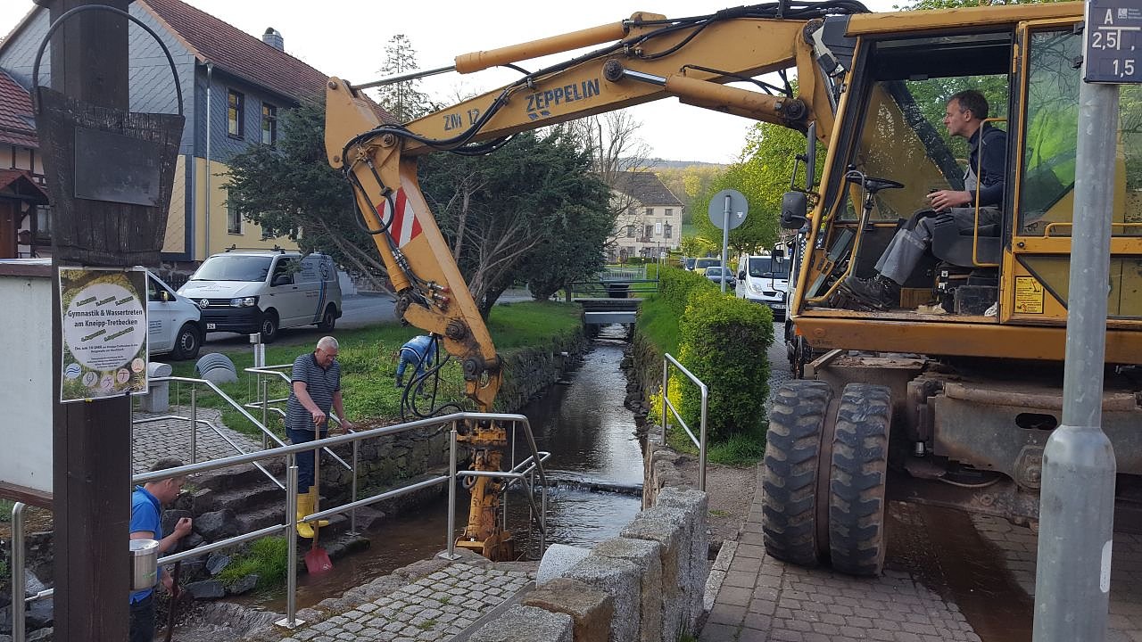 Autor: redDie Arbeiten führten am 28. April drei engagierte Neustädter aus: Mit Gummistifeln im Wasser, mit Schaufeln stehend: Mario Kühn und Herr König (Mann von Katharina König) und im Bagger Herr Ibe. Diese Arbeiten waren nötig, da durch das Winterhochwasser große, auch spitze Steine angeschwemmt wurden. Zunächst wurde das alte Grundmaterial (inkl. verrottetem Fliesdecken) im Becken herausgebaggert und dann abtransportiert. In den nächsten Tagen wird noch neuer runder Kies eingefüllt.