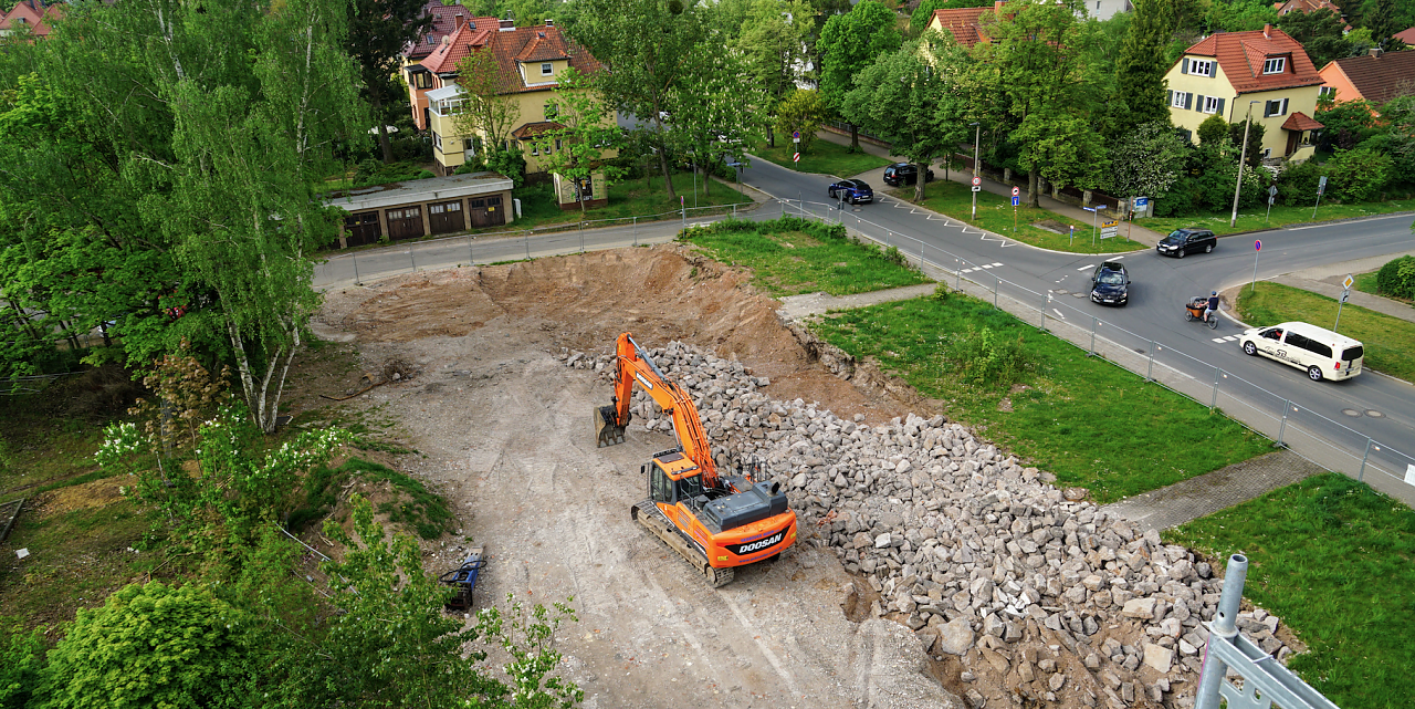 Blick auf die Baugrube, wo bis vor kurzem noch das Schwesternwohnheim stand. (Foto: SWG/Susanne Schedwill)