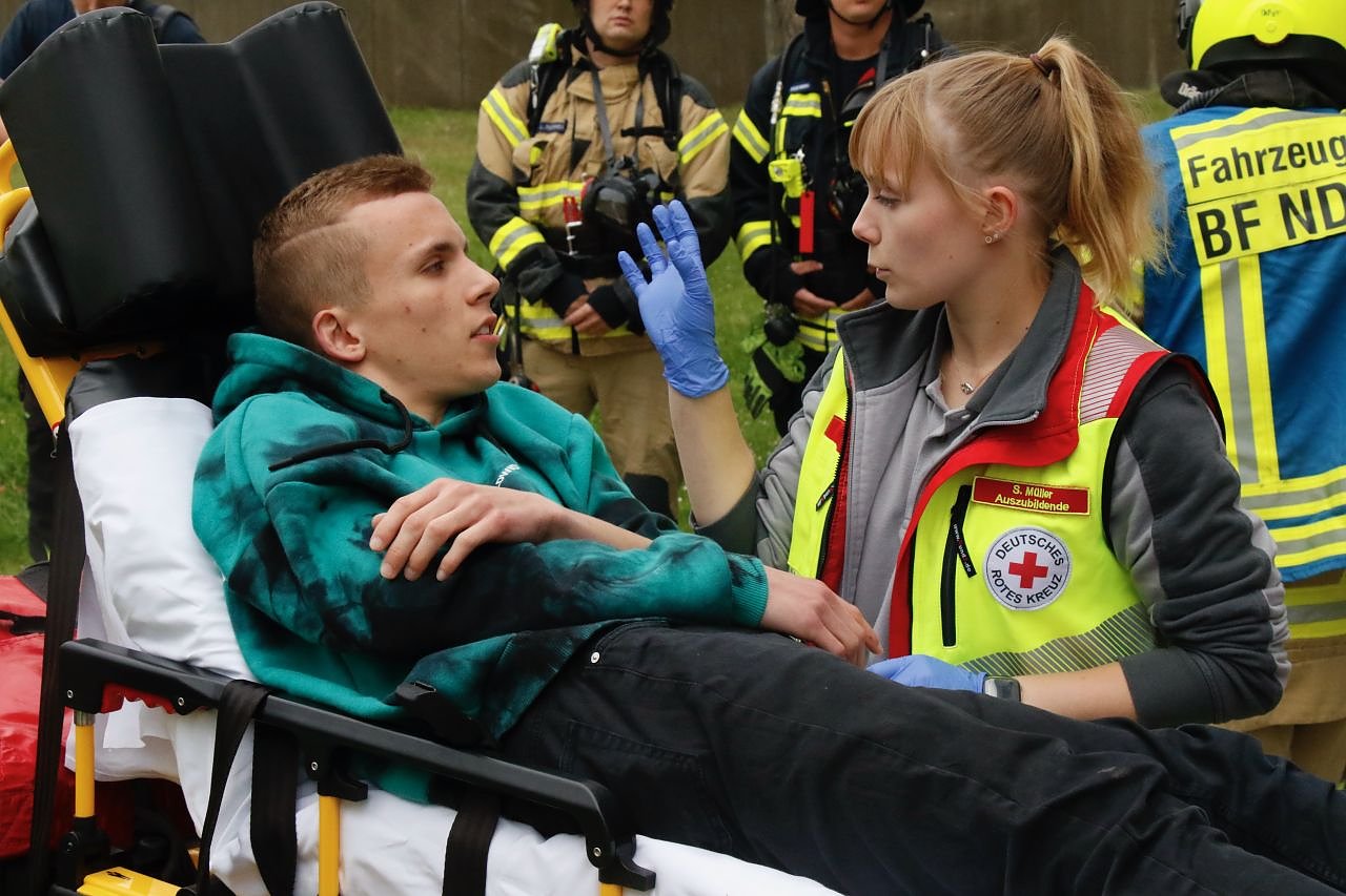 Am Ende sind sowohl die Beobachter sowohl auf Seiten der Feuerwehr wie auch auf der Seite des Rettungsdienstes zufrieden. Für das zweite Lehrjahr war das sehr, sehr gut. Sie haben vorausschauend gehandelt, ein Inhalationstrauma erkannt, die richtige Zielklinik gewählt und sehr schön strukturiert gehandelt, lobt Praxisanleiterin Mertens. Auch Wachabteilungsleiter Nolte hat ein genaues Auge auf die Abläufe geworfen und bis kurz vor Ende lief alles wie geplant. Exakt 43 Minuten nach Alarmierung waren alle Verletzten lokalisiert, geborgen und versorgt.