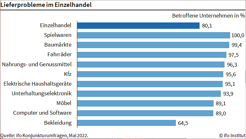 Im April waren es 67,1 Prozent, auf dem Höhepunkt im Dezember 81,6 Prozent. Das geht aus einer Umfrage des ifo Instituts hervor. Viele Waren stehen nicht im Regal, sondern im Container in einem Hafen von China, sagt der Leiter der ifo Umfragen, Klaus Wohlrabe. Der Konsument braucht somit eine gewisse Flexibilität beim Einkauf.