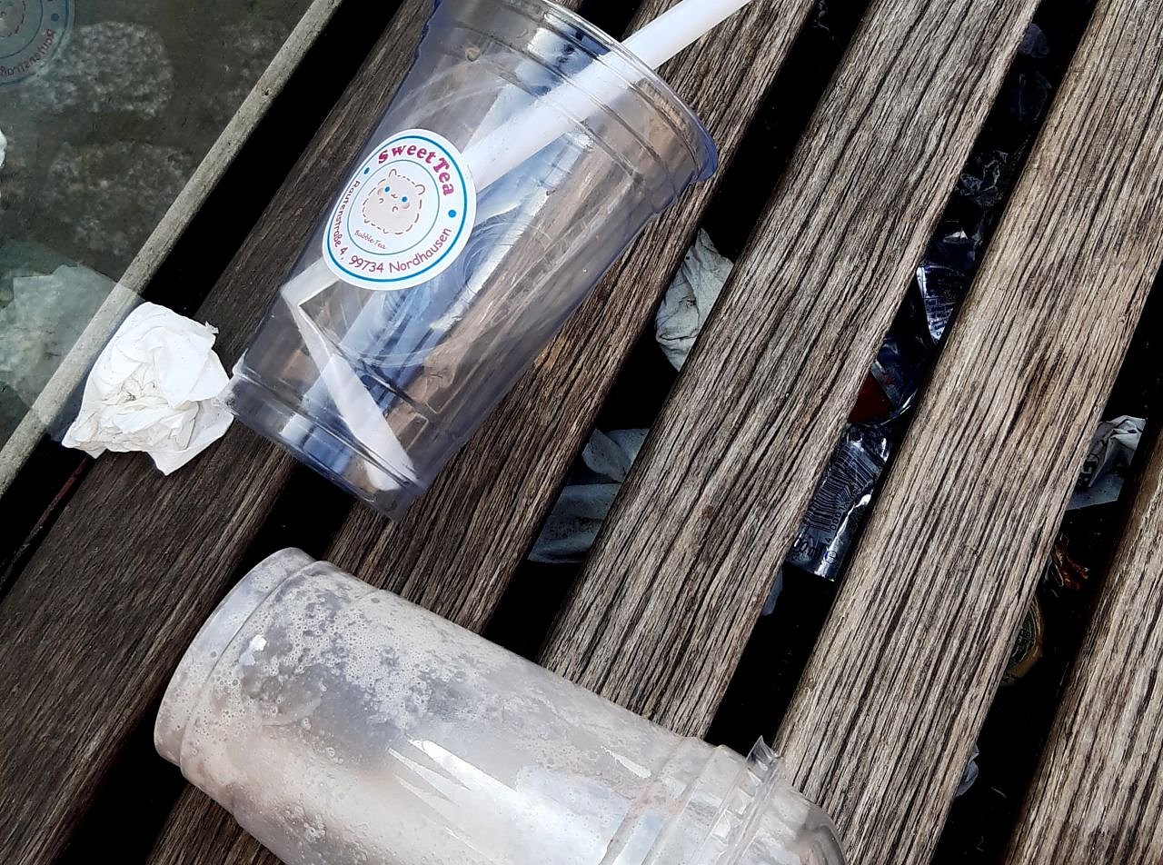 Autor: redIm Umkreis von gut zwanzig Metern war hier der Müll verteilt, der in den überfüllten Papierkorb an der Haltestelle nicht mehr hineinpasste. Bei näherer Betrachtung stellten sich die meisten herumliegenden Teile als Produkte des benachbarten Geschäftes Bubble Tea heraus. Das unschöne Phänomen einer verdreckten Straßenbahnhaltestelle ist aber leider nicht auf den Pfingstsonntag beschränkt, sondern vielen Nordhäusern schon früher aufgefallen, seitdem der Laden dort eröffnet wurde.