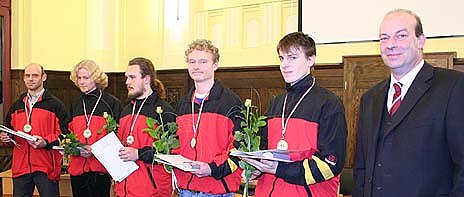 Insgesamt standen 16 aktive Sportler auf der Liste der Auszuzeichnenden. Mit hervorragenden sportlichen Leistungen in unterschiedlichen Disziplinen haben sie im vergangenem Jahr den Landkreis Nordhausen würdig vertreten. Und das nicht nur deutschlandweit, sondern auch europaweit. Heute standen sie zwar nicht auf dem sprichwörtlichen Siegertreppchen, dafür aber im Mittelpunkt des Geschehens. Landrat Joachim Claus würdigte in einer kurzen Ansprache die Leistungen der Sportfreunde und nahm im Anschluss die Auszeichnungen vor. Mit Urkunden und Plaketten wurden geehrt: Tino Bierau (Bronzemedaille), Thomas Biedermann (Bronzemedaille, Ron Hütcher (Goldmedaille), Robert Metze (1. Platz, 3. Platz), Tom Langelotz (Goldmedaille), Felix Lamm (Silbermedaille), Bastian Kruppe (Goldmedaille), Kay Döpping (Bronzemedaille), Andre Hoidn (2 Silbermedaillen), Robert Nüßle (1 Goldmedaille, 2 Silbermedaillen), Andre Röthling (Goldmedaille), Frank Pelny (Silbermedaille), Falko Große (Silbermedaille), Hagen Walter (Silbermedaille), Matthias Junkherr (Bronzemedaille) und Klaus Müller-Steidner (Bronzemedaille).
